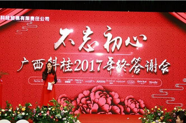 12月3日,廣西科桂2017年“不忘初心”年終答謝會在南寧市明園新都大禮堂隆重召開,科桂公司精品事業(yè)部總經(jīng)理黃翠冰女士攜各合作品牌的廠家領(lǐng)導(dǎo)、合作伙伴及新老客戶出席了此次會議。