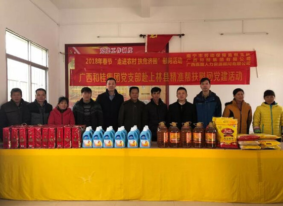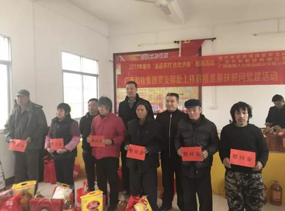 寒冬送溫暖,愛心滿和桂值2018年新春佳節(jié)即將到來之際,為了表達對困難戶、低保戶和貧困黨員的關(guān)愛和幫助,讓他們度過一個快樂、平安、祥和的新春佳節(jié)。2018年2月2日,廣西和桂集團黨支部書記周云同志、人力行政總監(jiān)梁偉同志等一行四人代表集團公司,會同我們的聯(lián)建單位-南寧市勞動保障監(jiān)察支隊黨支部書記趙斌同志帶領(lǐng)的支部成員,一起到南寧市上林縣白圩鎮(zhèn)龍樓村開展“寒冬送溫暖,愛心滿和桂”的精準扶貧,慰問貧困戶家庭的黨建活動。慰問團一行深入農(nóng)村,走進貧困家庭,為他們送去了慰問金和油、米、保適潔洗衣液、節(jié)日禮包等生活用品,送去了集團公司的關(guān)懷和溫暖。