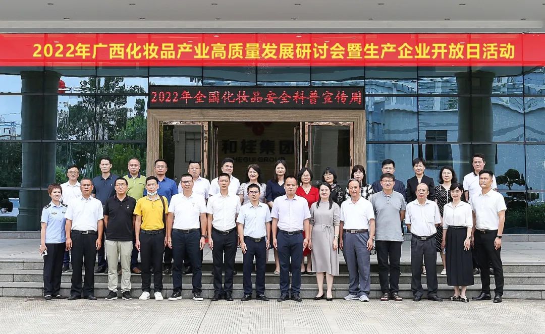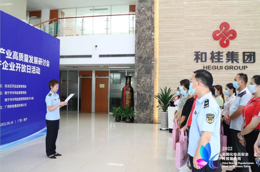 6月16日,廣西化妝品高質(zhì)量發(fā)展研討會(huì)暨生產(chǎn)企業(yè)開放日在和桂集團(tuán)舉行,作為2022年全國化妝品安全科普宣傳周廣西系列活動(dòng)之一,政府高度重視,社會(huì)廣泛關(guān)注。自治區(qū)藥品監(jiān)督管理局化妝品監(jiān)管處副處長唐文,南寧市市場監(jiān)督管理局黨組成員、副局長宋剛,自治區(qū)藥品監(jiān)管局南寧檢查分局局長梁柳青,廣西化妝品協(xié)會(huì)會(huì)長、廣西和桂集團(tuán)有限公司董事長黃偉文出席會(huì)議,行業(yè)專家學(xué)者、企業(yè)負(fù)責(zé)人、媒體單位,通過政府平臺(tái)公開征集的近30位公眾代表參加活動(dòng)。研討會(huì)由南寧市市場監(jiān)督管理局經(jīng)開分局局長金濤主持。